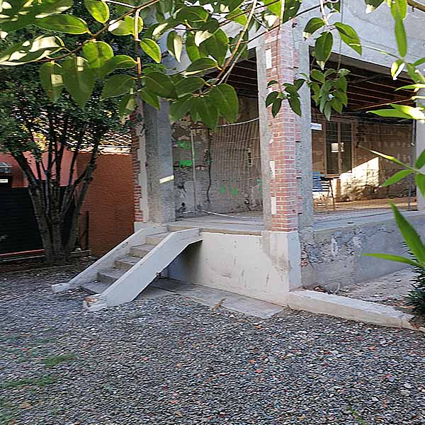Aménagement de la terrasse à mi niveau accompagnée de jardinières plantées pour apporter de la végétation visible de l’intérieur.