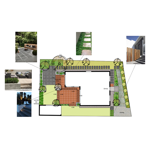 Les clients souhaitaient une terrasse proche de leur salon. Il était également important de maintenir une grande bande de gazon.