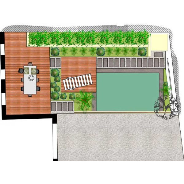 Aménagement du jardin sous forme de patio avec piscine de – de 10m², petit espace de bain de soleil et reprise de la terrasse.