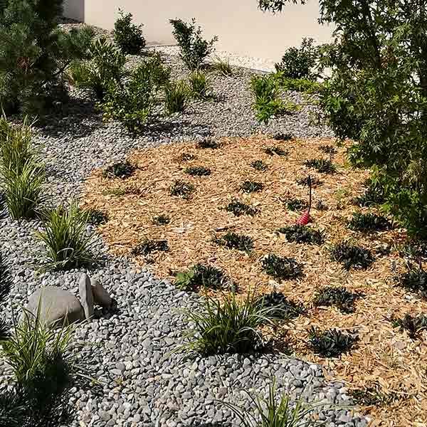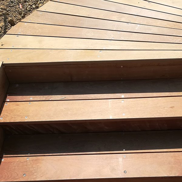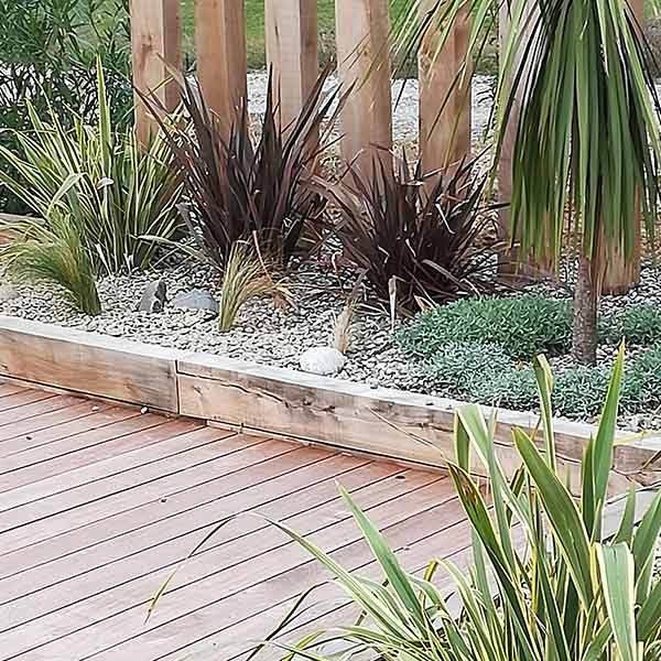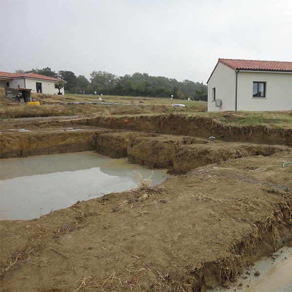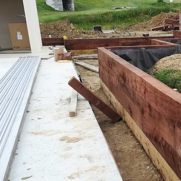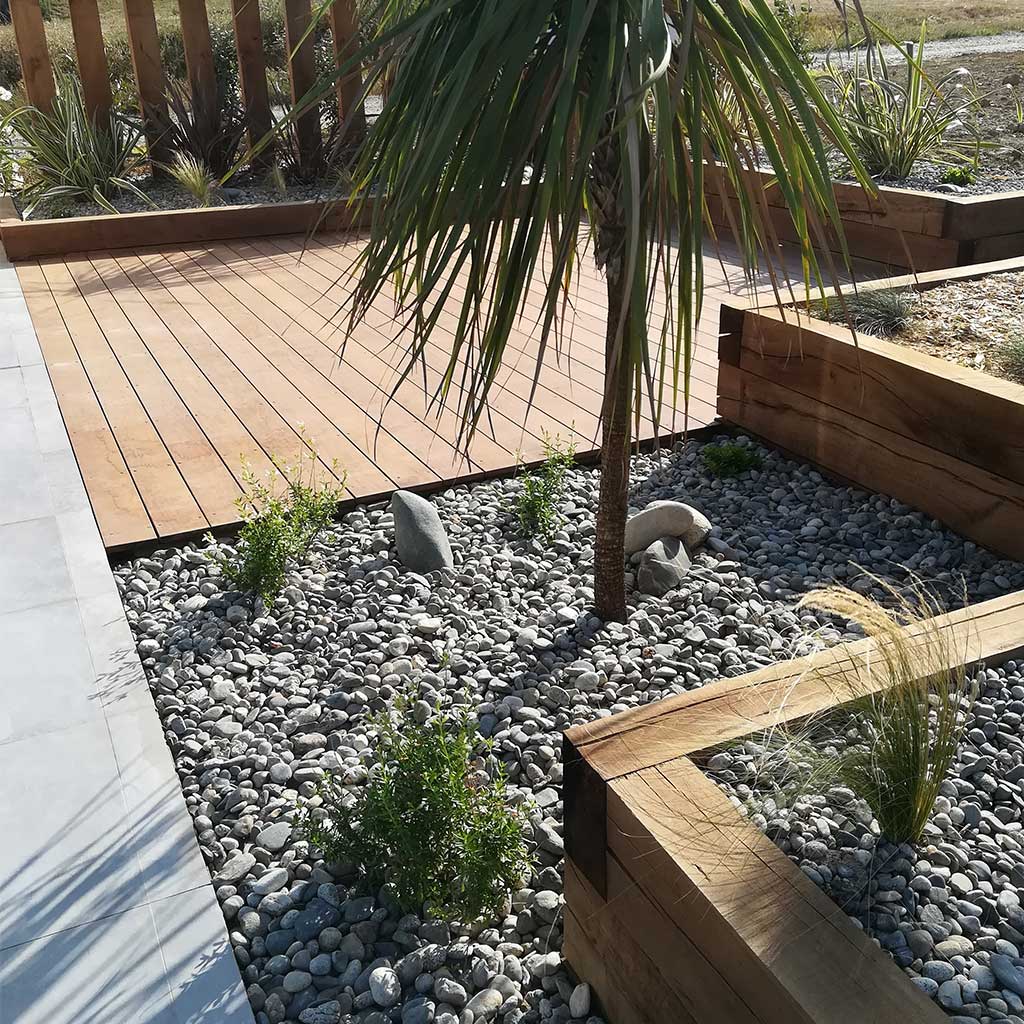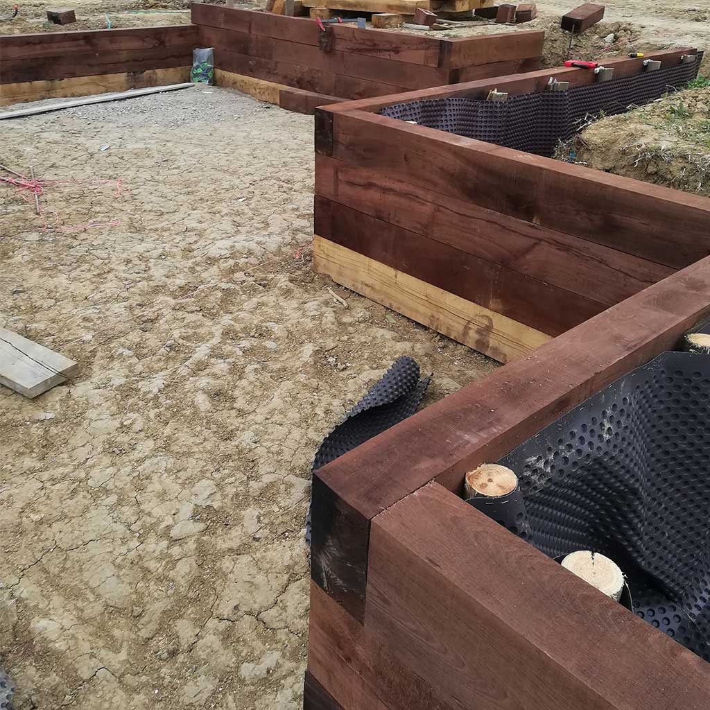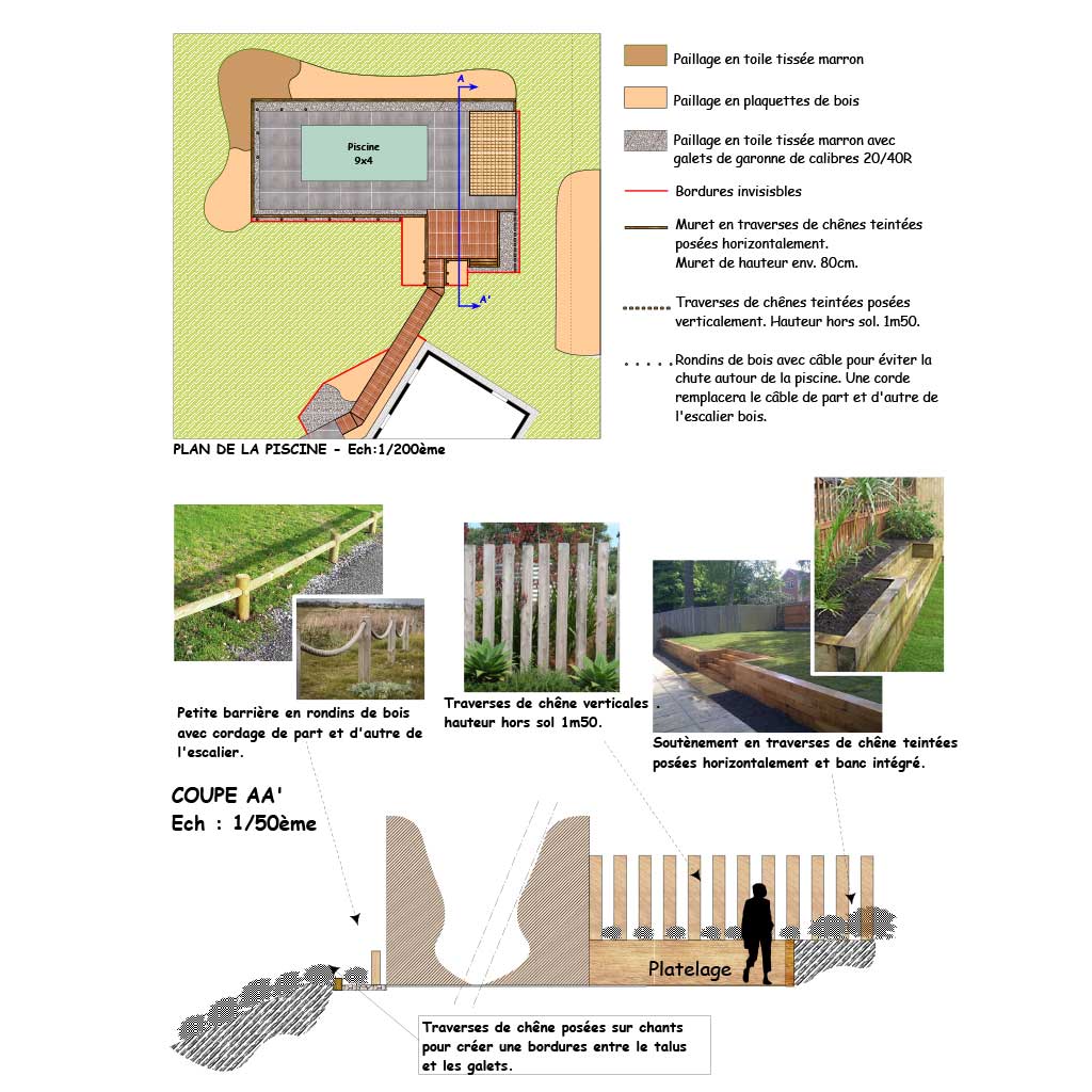 Emplacement de la piscine avec zone de circulation. Un système de murets en traverses de chênes a été crée pour palier aux différences de niveaux. Positionnement de différents espaces de détente autour de la piscine.